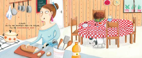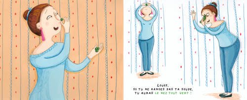 "Si tu ne manges pas ta soupe, tu auras un nez tout vert..., Si tu ne manges pas ta soupe, tu resteras tout petit... Si tu ne manges pas ta soupe, la sorcière Bougougnou te jettera un sort... Si tu ne manges pas ta soupe, des cheveux pousseront dans tes oreilles..." Quelle énergie pour arriver à faire avaler sa soupe à Louis ! Mais quand papa s'installe à table (il est tout petit, a un nez vert et des cheveux dans les oreilles), plus questions de chipoter ! Louis engloutit sa soupe et... en redemande !